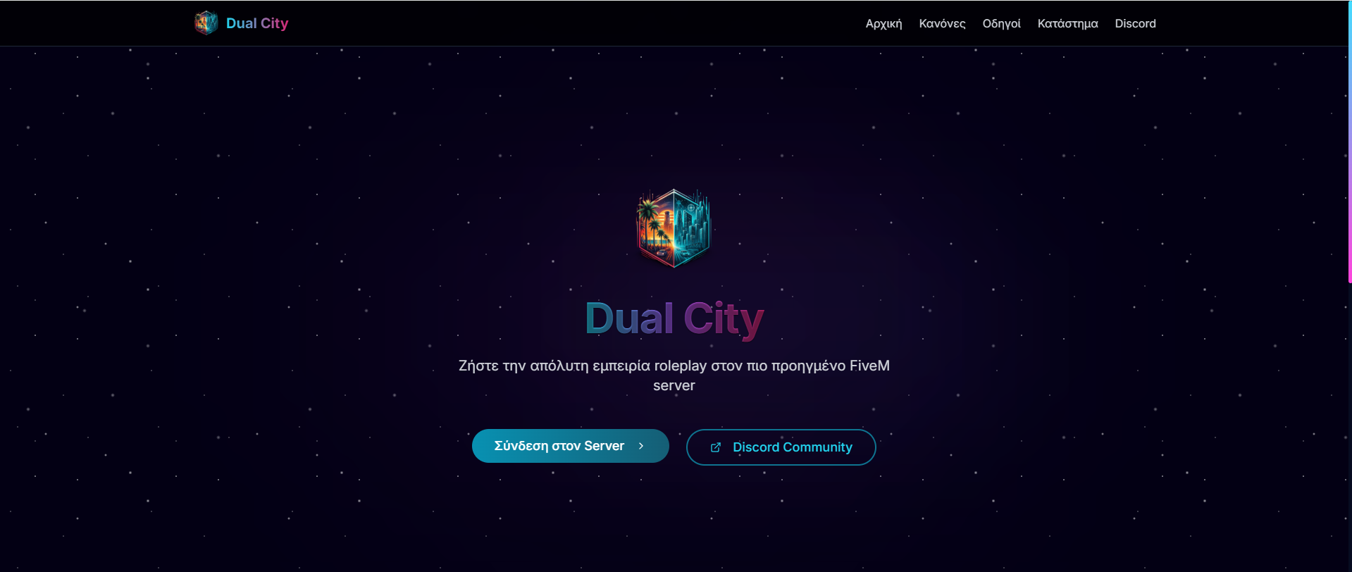 Προηγμένος FiveM roleplay server με μοναδικές εμπειρίες. Ιστοσελίδα με Discord integration, οδηγούς, κανόνες server, online store και ενεργή κοινότητα. Modern design με focus στην user experience και community engagement.