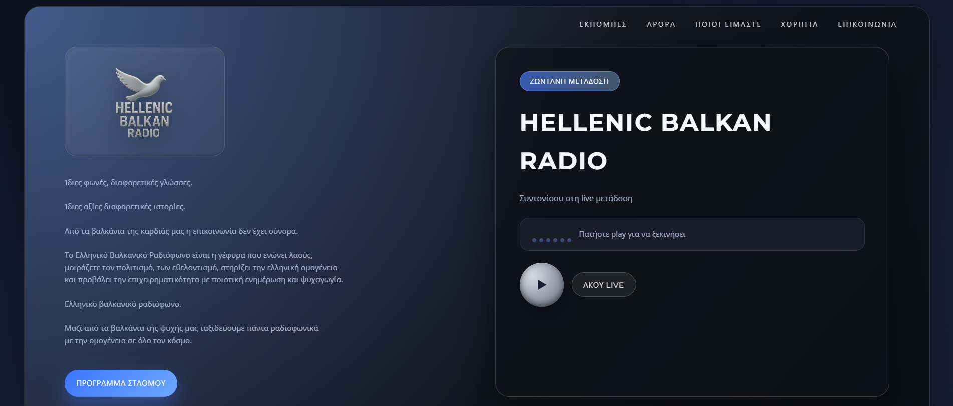 Ιστοσελίδα για online radio station με live streaming integration, schedule, playlists και community features. Modern design με focus στην audio experience.