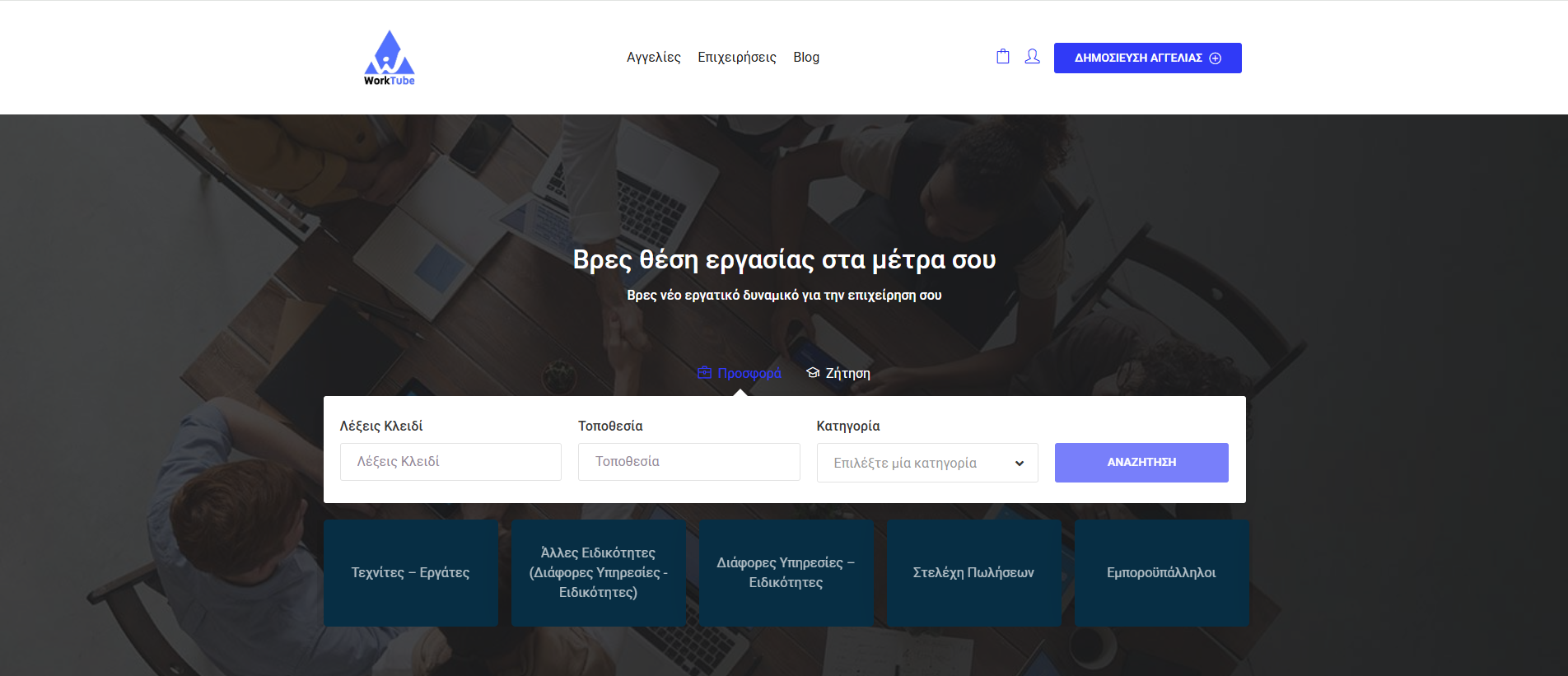 Πλατφόρμα αγγελιών εργασίας με advanced search, company profiles, blog section και user dashboard. Full-featured platform για job seekers και employers. Responsive design με modern UI/UX.